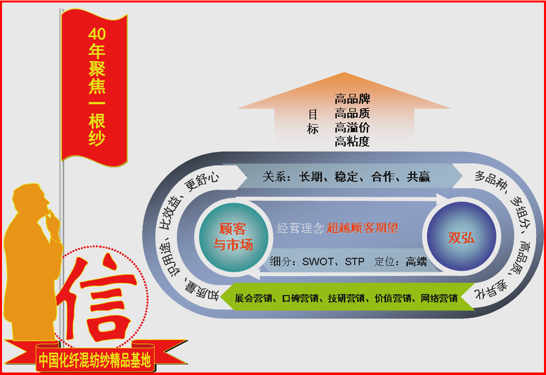 Concentrarea pe clienți și îmbunătățirea mărcilor sunt cerințele hotărâte și activitățile ferme ale tovarășului Ji Yijun în activitatea sa. Under his advocacy, the company has formulated the business philosophy of "using the rigorous management, spinning the quality yarn, and climbing the -end customers", with "high brand, high quality, high premium, and high stickiness" as the goal, using "SWOT, STP" and other tools to investigate and segment the market, lock in key customer groups, adopt a "small batch, multiple varieties, fast delivery, high quality" fast marketing strategy, implement "exhibition marketing, word-of-mouth marketing, technical research marketing, knowledge marketing, value marketing, network marketing" and other methods, and use the "30 Articles of Double Great Service Guidelines" to let customers "know the quality, recognize the purpose, compare benefits, fast delivery, and more comfortable", establish a "long-term, stable, cooperative, and win-win" customer relationship, and form a highly competitive Double Great marketing model to win and maintain customer satisfaction and loyalty and achieve the common development of customers and Double Great.
