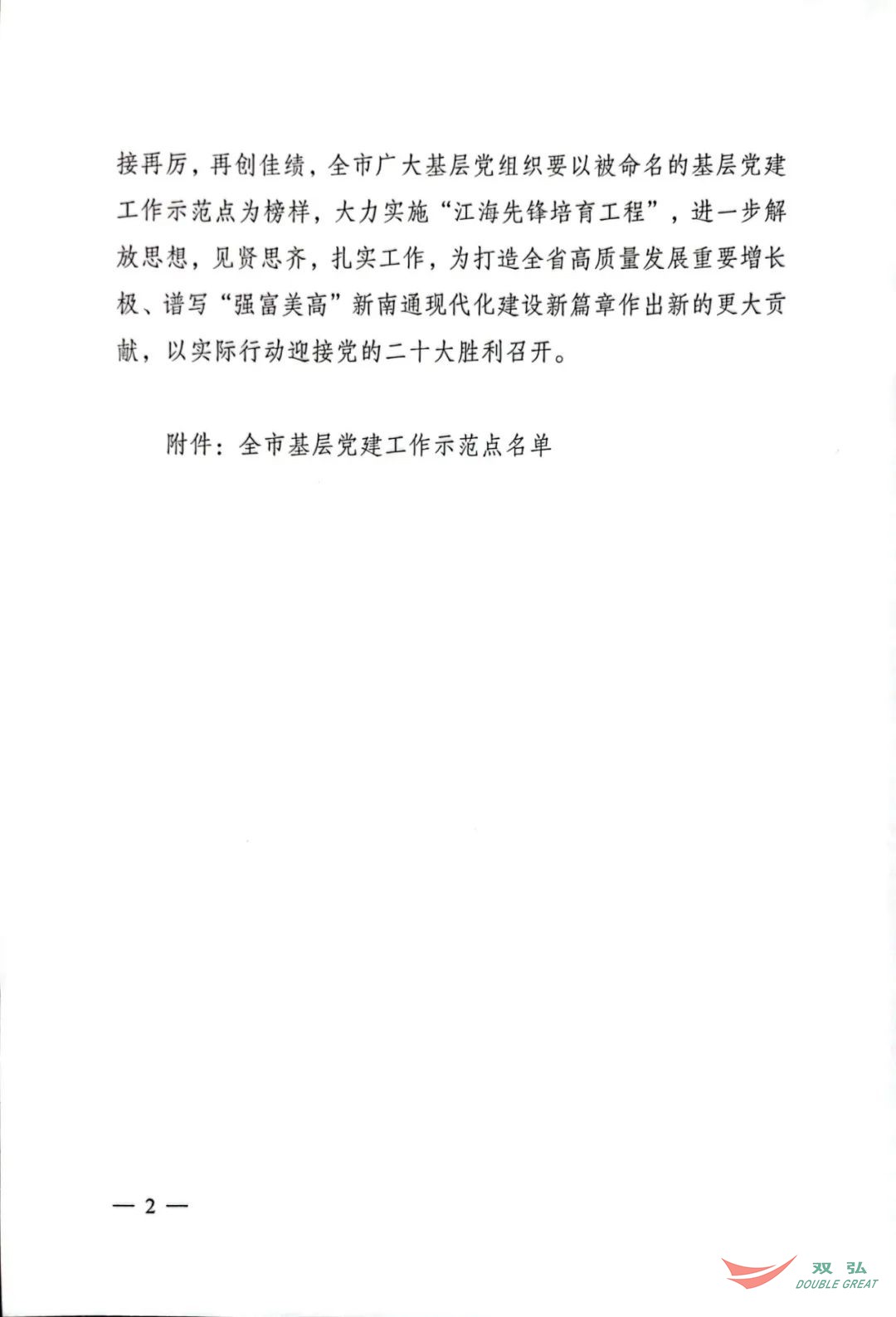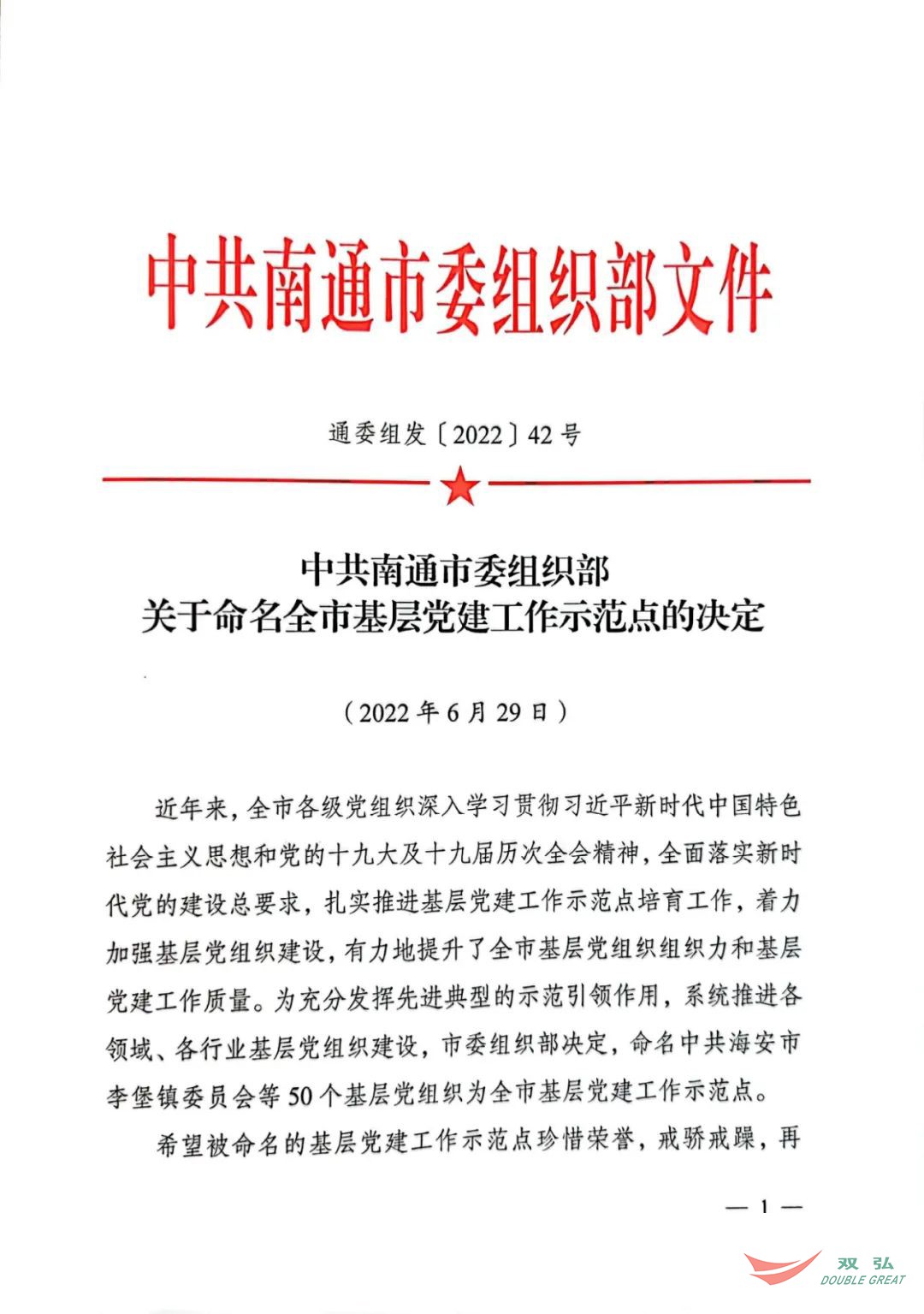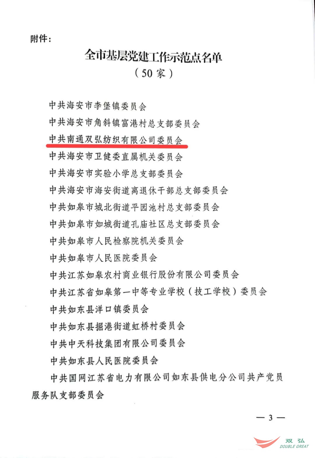 Recent, Departamentul de Organizare al Comitetului municipal CPC Nantong a emis un document numind 50 de organizații de partid de bază ca site -uri de demonstrație a partidului de bază ale orașului. Comitetul de partid al Nantong Double Greattile Textile Co., Ltd. a primit titlul de „Site -ul de demonstrație al clădirii petrecerii orașului”.